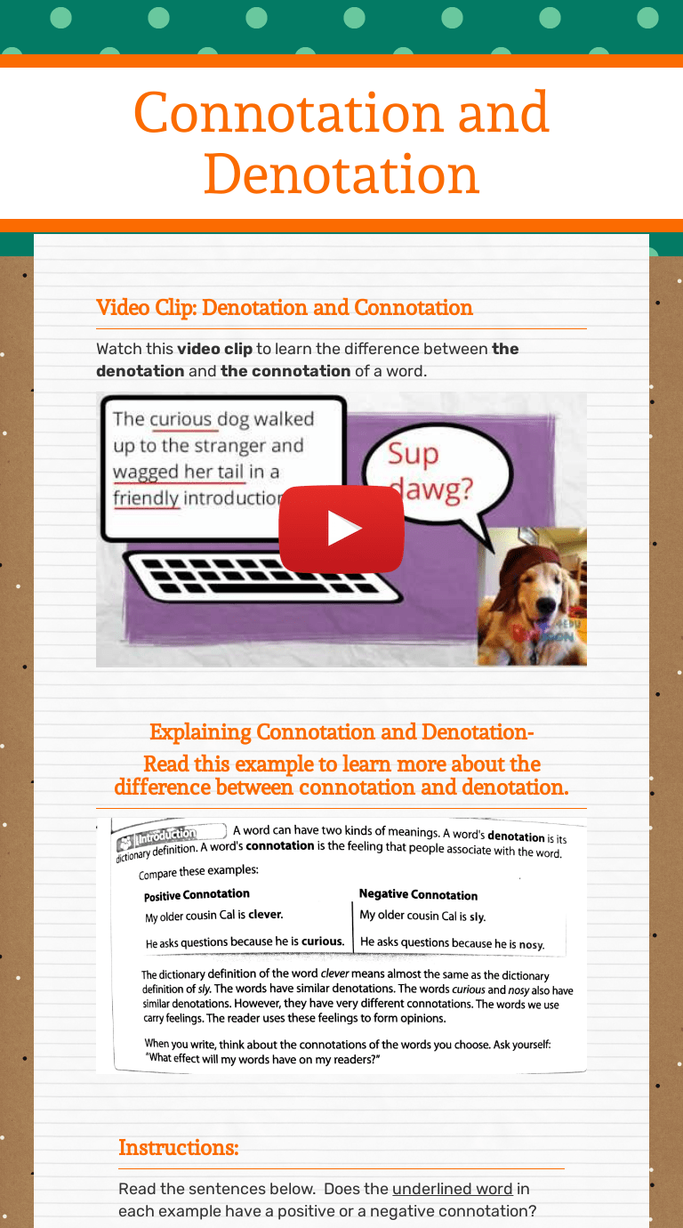 In this excerpt, the narrator is describing how an exasperated aunt … These worksheets work on the use of connotation and denotation of words. Next, write a sentence using the Choose a word from the previous word bank.look up the part of speech and denotative definition of the word. While the literal meaning of a word may not be emotionally charged, the connotation could cause some people to be offended.